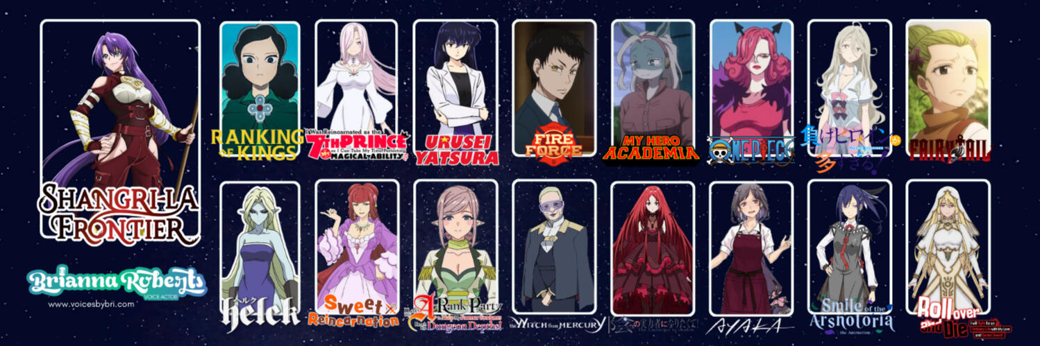 Brianna has been singing and acting on stage for over 20 years. Developing a character and bringing it to life for an audience has always fed her creative soul. You can often find her performing on stage with various theaters in DFW.She started her voice acting journey in 2013 and fell in love with the art and challenge of bringing words to life in a natural and interesting way. She made her anime debut in 2018 and has voiced characters in many shows since then. She is best known for voicing Pencilgon in Shangri-La Frontier, Sakura in Urusei Yatsura, Hyura in Helck, Capt. Kayoko Huang in Fire Force, Miranjo in Ranking of Kings, Galette in One Piece, Yuriko Tsumura in Smile Down the Runway and Grammi in Fairy Tail to name a few. She has also lent her voice to titles such as My Hero Academia, Fruits Basket, Attack on Titan, Mobile Suit Gundam: The Witch from Mercury, Sweet Reincarnation, Reincarnated as the 7th Prince, The Eminence in Shadow and many more! You can also hear her in video games such as Kaida in Diablo IV, Belvedance in Tiny Tina's Wonderlands and Sea Nymph Sol, Crystal Gaze Medusa and Ragnarok Hera in the video game SMITE and Shattered Vision Princess Bari in SMITE 2. Additionally, she is an audiobook narrator.She holds a Communications Degree in Digital Media and has worked in the industry in many different roles; actor, producer, photographer, talent agent and most recently a casting assistant. She's gained a rounded view of the industry based on her experience in various positions. She is easy to work with and strives for excellence in all she does.Outside of voice acting and theatre, Brianna likes reading, photography, being out in nature and horses. She also loves marine biology and considers herself an amateur aquarist and enjoys caring for her 60 gallon tank of tropical fish. She also particularly loves chocolate chip cookies, waffles and coffee.
